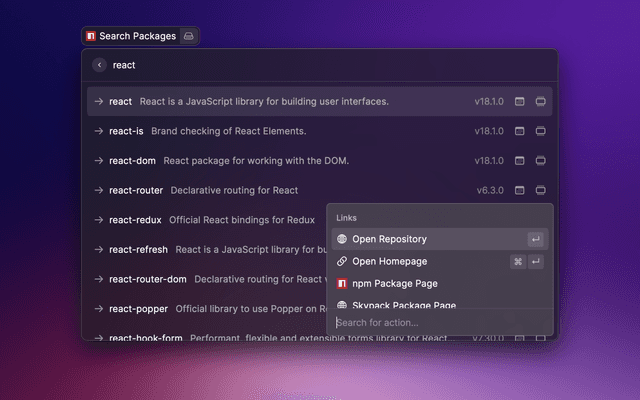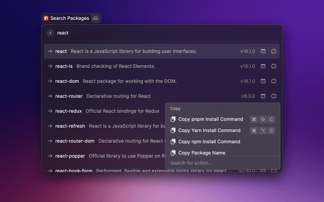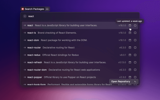 Raycast extension to search for npm packages using npms.io