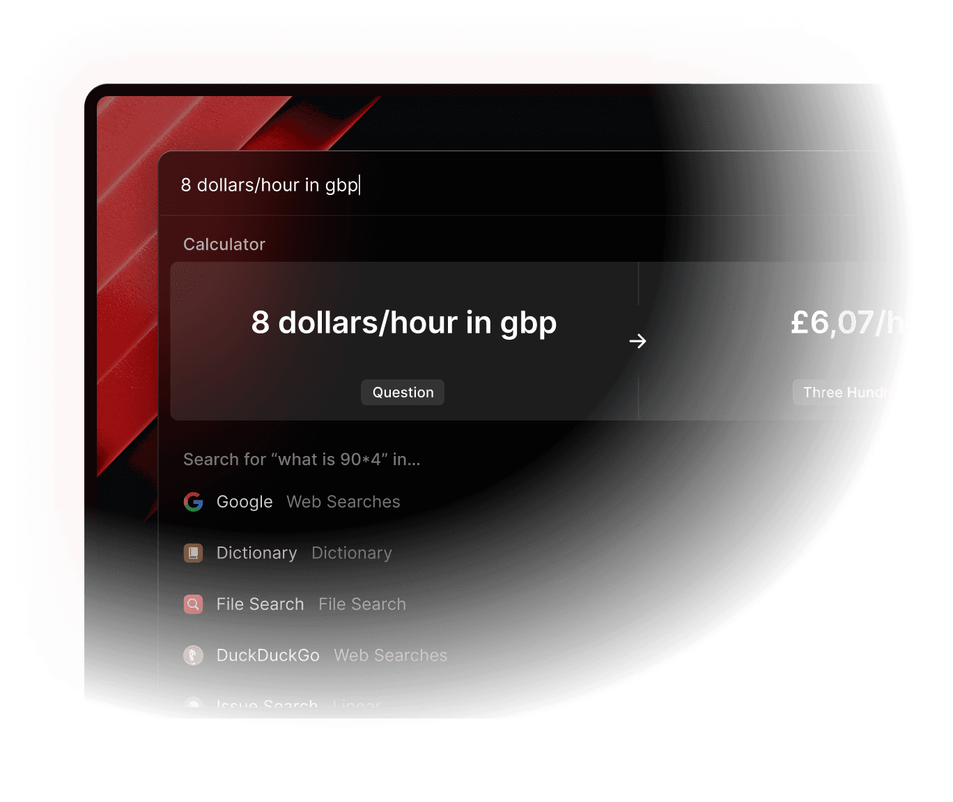 Simply type an expression to solve equations or perform conversions. You can then copy the answer to your clipboard, and carry on with what you were doing before.